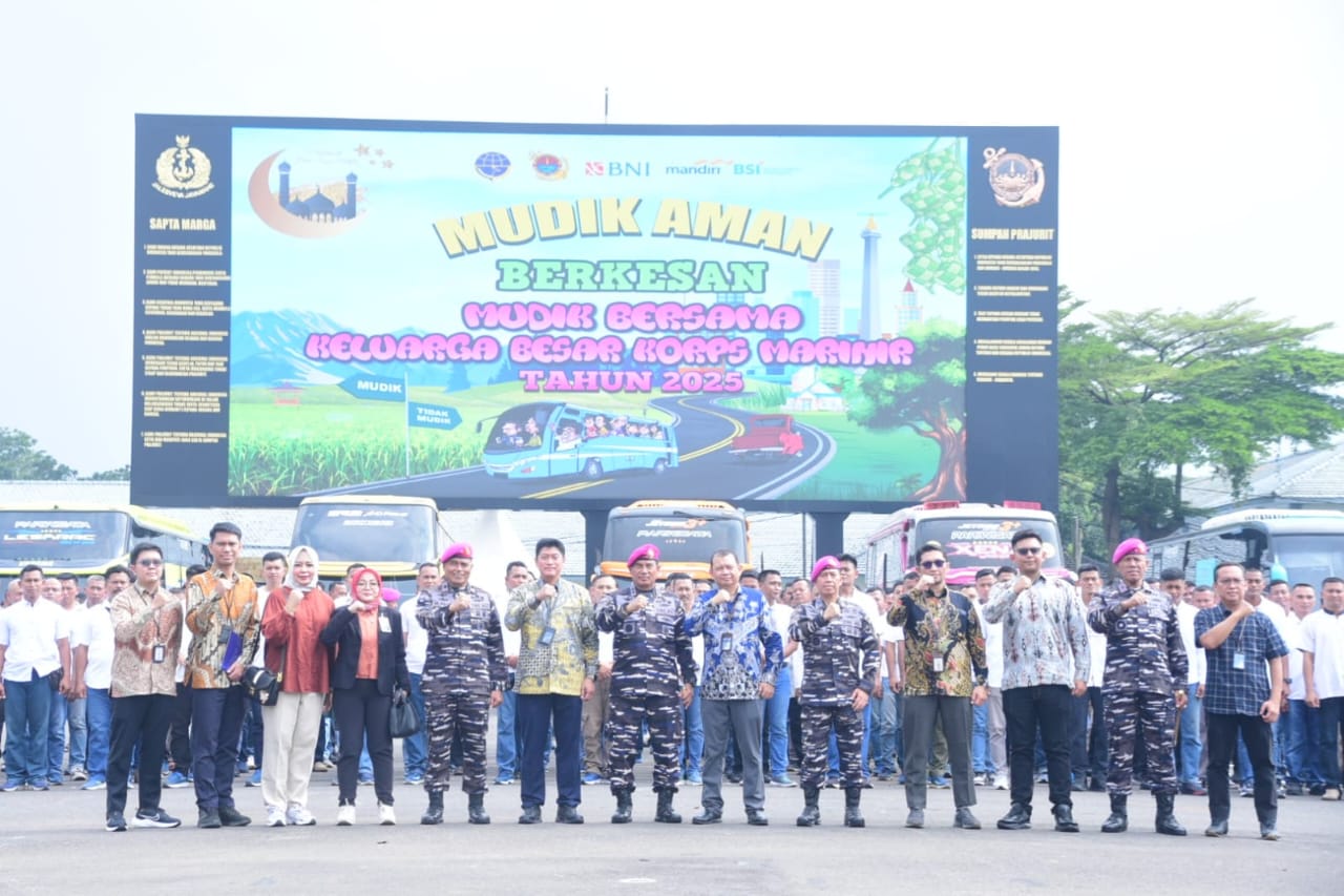 Komandan Pasmar 1 (Danpasmar 1) Brigjen TNI (Mar) Umar Farohq, S.A.P., CHRMP., M.Tr.Opsla., M.Han., mengikuti acara pelepasan mudik bersama keluarga besar Korps Marinir di Lapangan Apel Brigif 1 Kesatrian Marinir Hartono Cilandak, Jakarta Selatan, Kamis (27/03/2025).